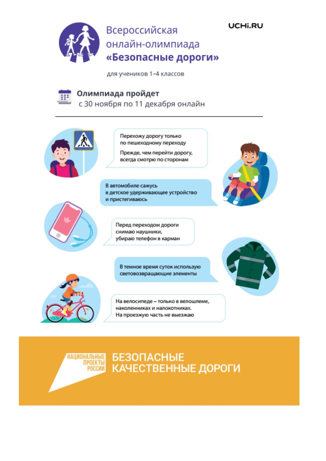 С 30.11.2020 по 11.12.2020 года на платформе Учи.ру проходит Всероссийская онлайн-олимпиада для учащихся 1-4 классов «Безопасные дороги». Принимаем участие!!!