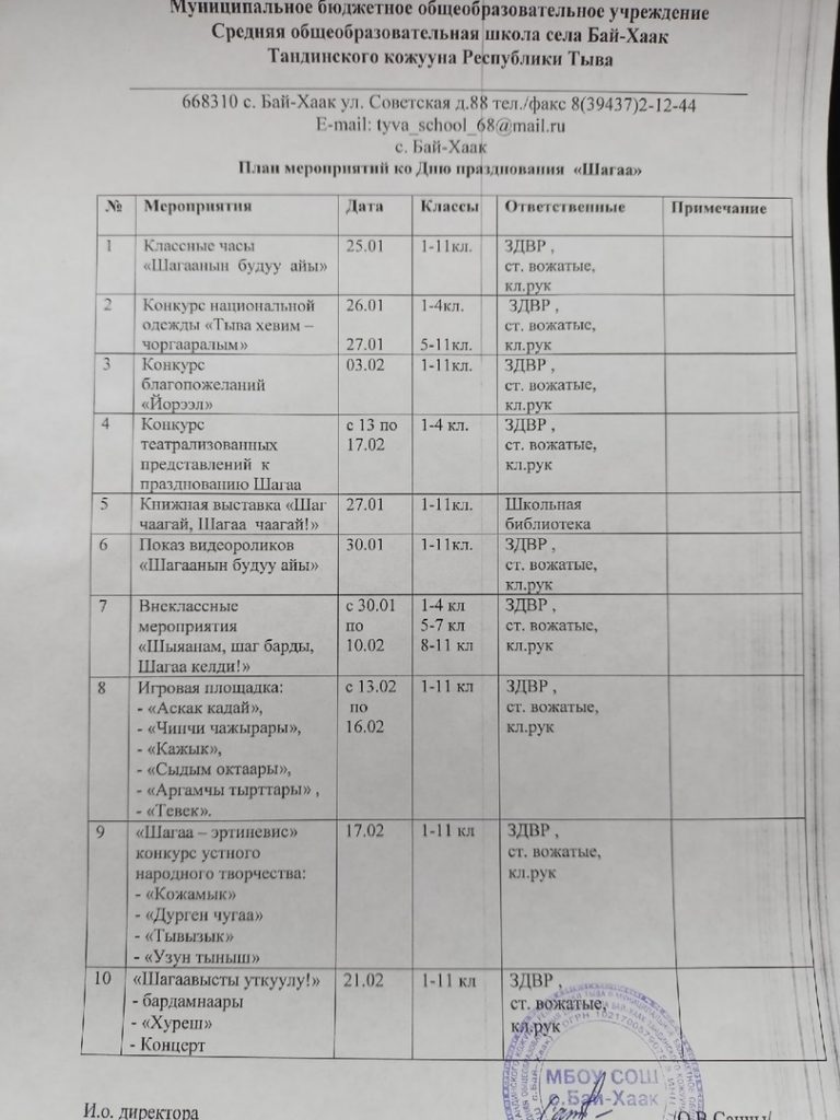 План мероприятий тувинского национального праздника в МБОУ СОШ с Бай-Хаак «Шагнын чаазы, Шагаа чаагай!»