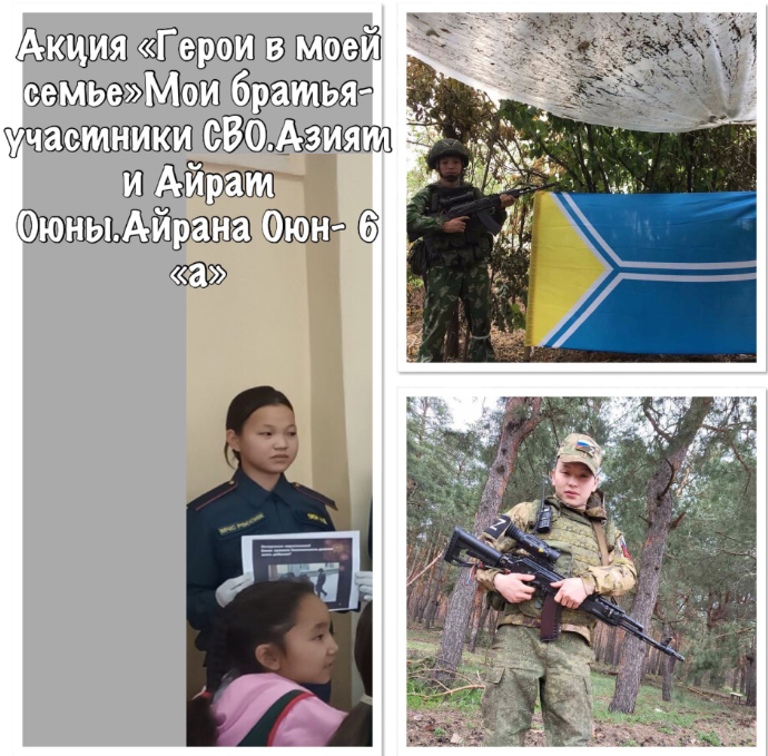 Основы правильного воспитания патриотов страны закладываются в семье, затем — в школе! Вдвойне гордишься своими родными, если они — Герои Дня-Участники СВО. В моей семье мои братья,выпускники Бай-Хаакской средней школы, Азият и Айрат Вячеславовичи-наша гордость! Я как кадет МЧС-класса, 6 «а», Айрана Оюн, в том числе и вся семья очень ждем их с Победой! Горжусь ими!