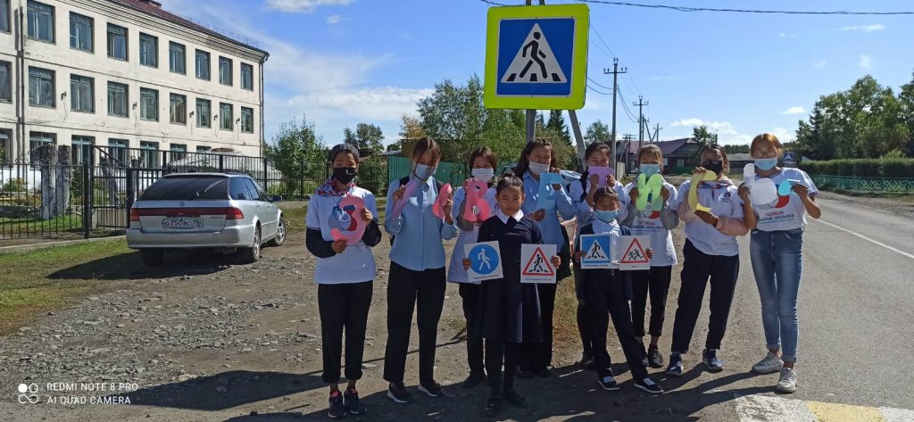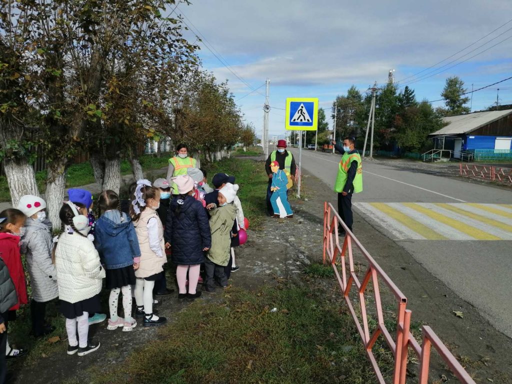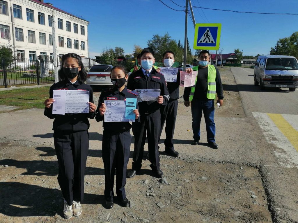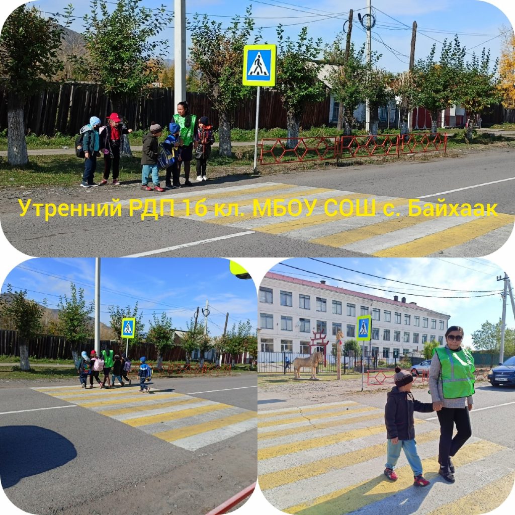 Ежедневное утреннее патрулирование около пешеходного перехода вблизи школы с. Бай-Хаак. Охват 71 ученик начальной школы 15 сентября 2022 г.